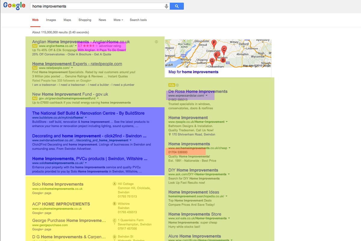 Here is a search results page for a ‘Home Improvements’ search made in Swindon. You can see many advertisers are using paid search ads (PPC) with various ‘ad-ons’ such as review extensions and social extensions in their ads.
