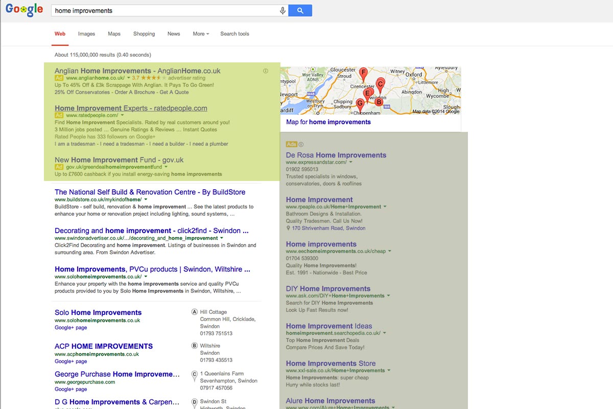 Here is a search results page for a ‘Home Improvements’ search made in Swindon. You can see many advertisers are using paid search ads (PPC) with various ‘ad-ons’ such as review extensions and social extensions in their ads.