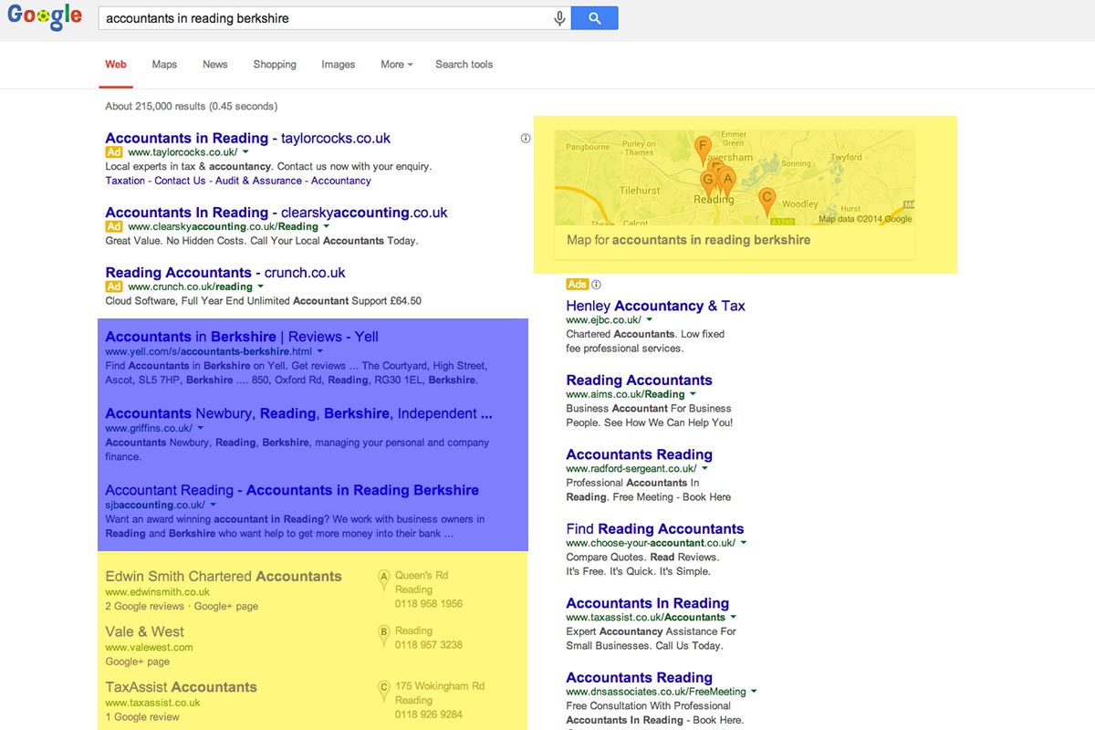 The map appearing top right is powered by having Google Places set up where you tell Google where all your branches are. This has effectively replaced most of the standard natural search listings. If this search had been done on a mobile device even more weight would be given to very local searches. Try searching for restaurants or pizza places on your phone when you are next in your local town – you will see what we mean!